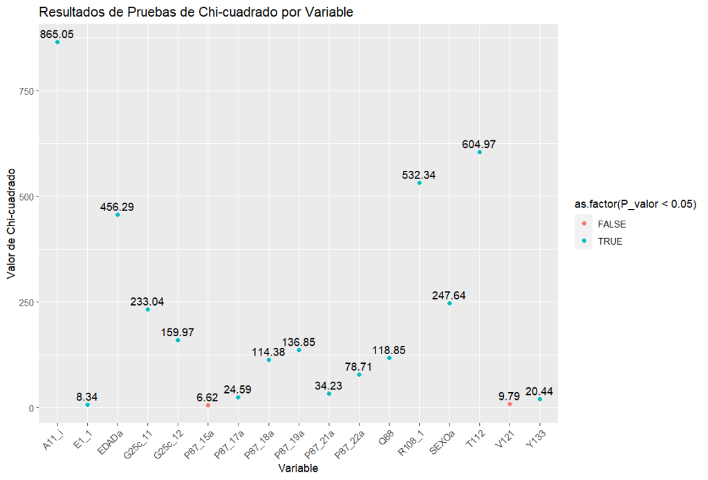 - Es importante considerar que estos resultados son asociaciones y no implican causalidad. Además, las advertencias sobre las aproximaciones del chi-cuadrado sugieren que algunos de los resultados deben interpretarse con precaución, especialmente cuando las frecuencias esperadas en las tablas de contingencia son bajas.